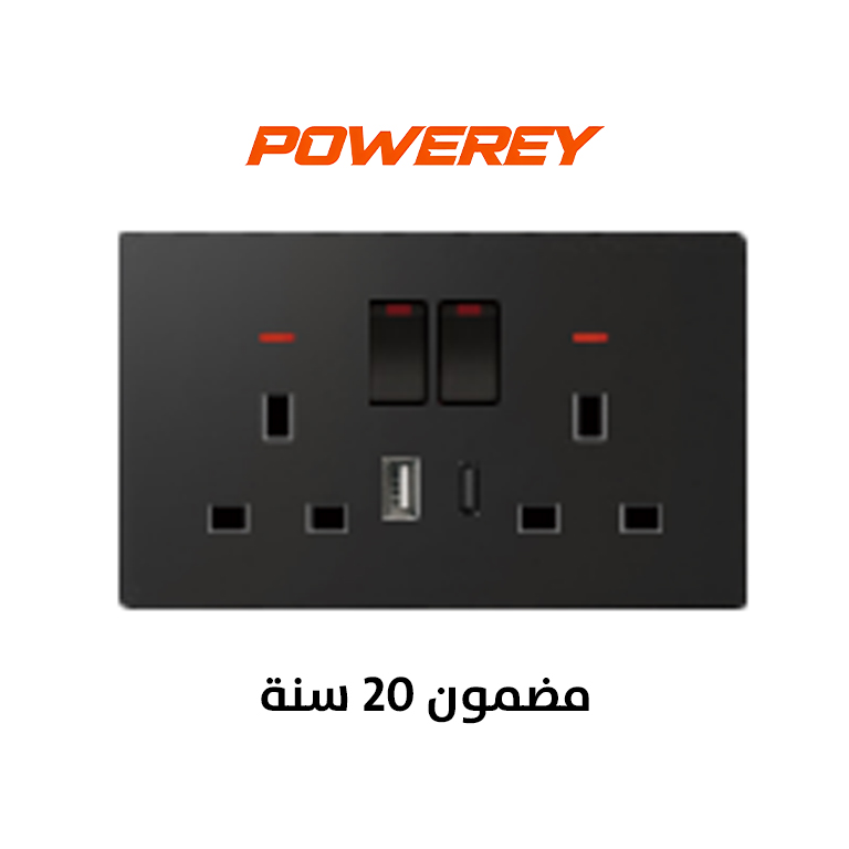 Powerey Switche 2 gang 13A socket+USB+Type C ( Essential ) BLACK
